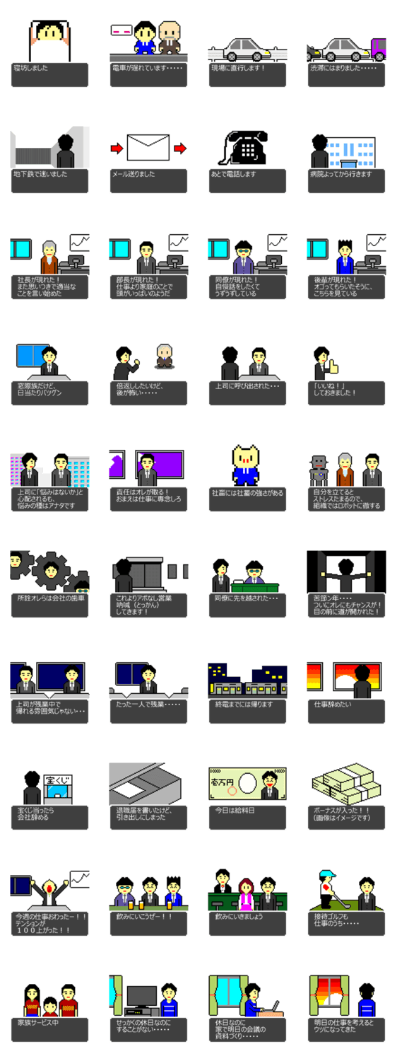 8ビット・ピクチャー2サラリーマン悲壮編 ヒデマロ コメントをどうぞ 8ビット・ピクチャー待望の第二弾登場!今度はアドベンチャーゲームテイストでサラリーマンライフをスタンプで彩ります☆ このスタンプどう思う?!↓クリックで投票♪好き (0)かわいい (0)かっこいい (0)おもしろい (0)使いやすそう (0)欲しい (0)萌え (0)ほっこりする (0)おしゃれ (0)ゆるい (0)こわい (0)ウザい (0)キモい (0)ムカつく (0)持ってる (0)癒される (0)セクシー (0)個性的 (0)私は買わない (0)誰かプレゼントして! (0) 購入・プレゼントする Facebookでシェア Twitterでシェア