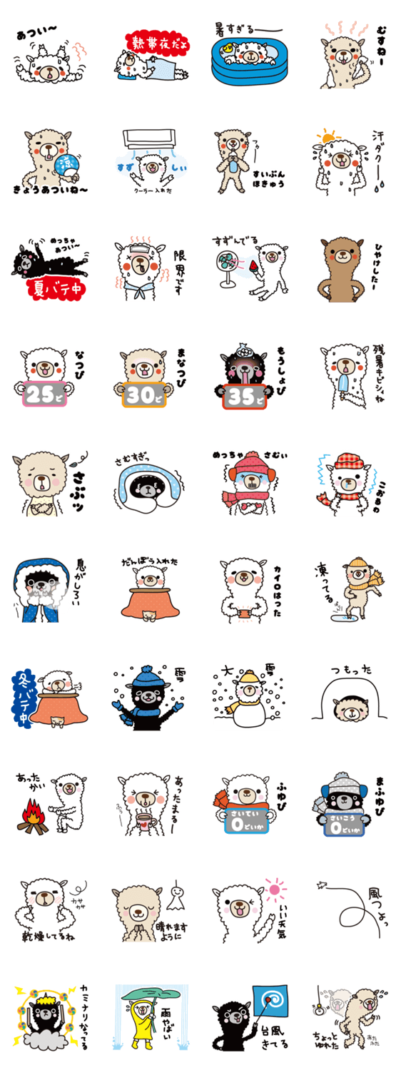 3匹のアルパカさん – 暑かったり寒かったり kiko コメントをどうぞ 3匹のアルパカさんが、様々な「暑い」「寒い」を表現するスタンプ。お天気の日常会話用に。 このスタンプどう思う?!↓クリックで投票♪好き (0)かわいい (0)かっこいい (0)おもしろい (0)使いやすそう (0)欲しい (0)萌え (0)ほっこりする (0)おしゃれ (0)ゆるい (0)こわい (0)ウザい (0)キモい (0)ムカつく (0)持ってる (0)癒される (0)セクシー (0)個性的 (0)私は買わない (0)誰かプレゼントして! (0) 購入・プレゼントする Facebookでシェア Twitterでシェア