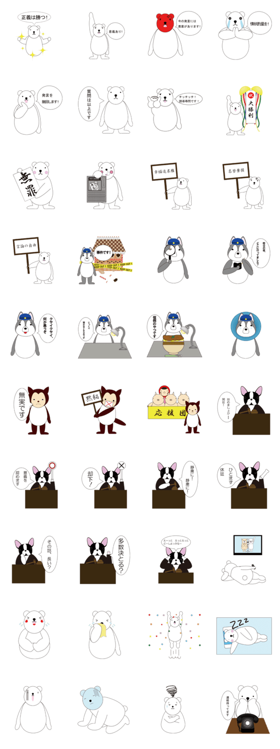 Animal Legal can コメントをどうぞ 正義に燃える白熊の弁護士と、フレンチブルドッグの裁判官、犬のお巡りさんや無実を訴える狼。法律用語でトークを盛り上げてみましょう! このスタンプどう思う?!↓クリックで投票♪好き (0)かわいい (0)かっこいい (0)おもしろい (0)使いやすそう (0)欲しい (0)萌え (0)ほっこりする (0)おしゃれ (0)ゆるい (0)こわい (0)ウザい (0)キモい (0)ムカつく (0)持ってる (0)癒される (0)セクシー (0)個性的 (0)私は買わない (0)誰かプレゼントして! (0) 購入・プレゼントする Facebookでシェア Twitterでシェア