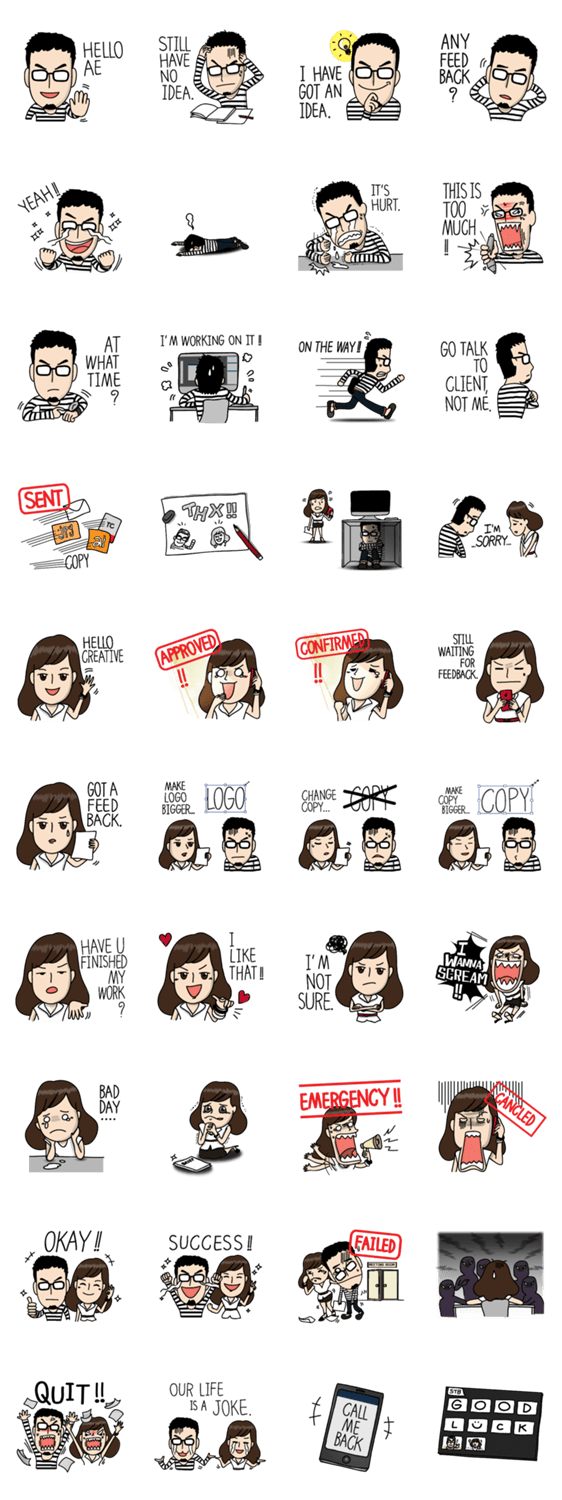 Creative V.S. AE Pubbpaduwup コメントをどうぞ Welcome to the hilarious life in an advertising agency where you will find joy, fun, rushness, deeply pain, frustrations and much more. このスタンプどう思う?!↓クリックで投票♪好き (0)かわいい (0)かっこいい (0)おもしろい (0)使いやすそう (0)欲しい (0)萌え (0)ほっこりする (0)おしゃれ (0)ゆるい (0)こわい (0)ウザい (0)キモい (0)ムカつく (0)持ってる (0)癒される (0)セクシー (0)個性的 (0)私は買わない (0)誰かプレゼントして! (0) 購入・プレゼントする Facebookでシェア Twitterでシェア