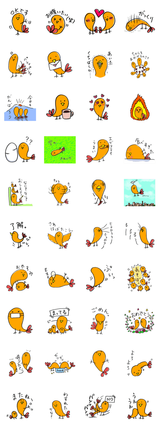 Ebifuraidori 大盛茂子 コメントをどうぞ エビフライそっくりな鳥たち。自力で飛ぶ姿を、まだ誰も見たことはない。 このスタンプどう思う?!↓クリックで投票♪好き (0)かわいい (0)かっこいい (0)おもしろい (0)使いやすそう (0)欲しい (0)萌え (0)ほっこりする (0)おしゃれ (0)ゆるい (0)こわい (0)ウザい (0)キモい (0)ムカつく (0)持ってる (0)癒される (0)セクシー (0)個性的 (0)私は買わない (0)誰かプレゼントして! (0) 購入・プレゼントする Facebookでシェア Twitterでシェア