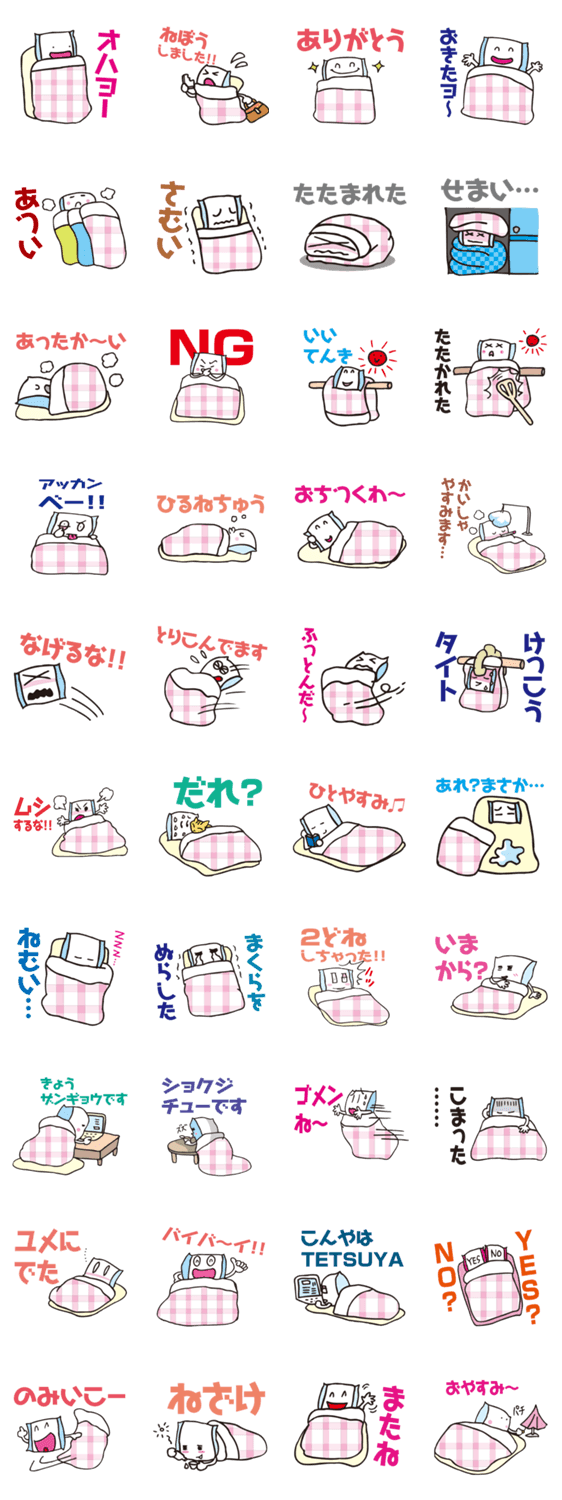 futonちゃん 前野 コトブキ コメントをどうぞ 眠い朝は布団だって眠い!そんな布団の声を集めてみました! このスタンプどう思う?!↓クリックで投票♪好き (0)かわいい (0)かっこいい (0)おもしろい (0)使いやすそう (0)欲しい (0)萌え (0)ほっこりする (0)おしゃれ (0)ゆるい (0)こわい (0)ウザい (0)キモい (0)ムカつく (0)持ってる (0)癒される (0)セクシー (0)個性的 (0)私は買わない (0)誰かプレゼントして! (0) 購入・プレゼントする Facebookでシェア Twitterでシェア