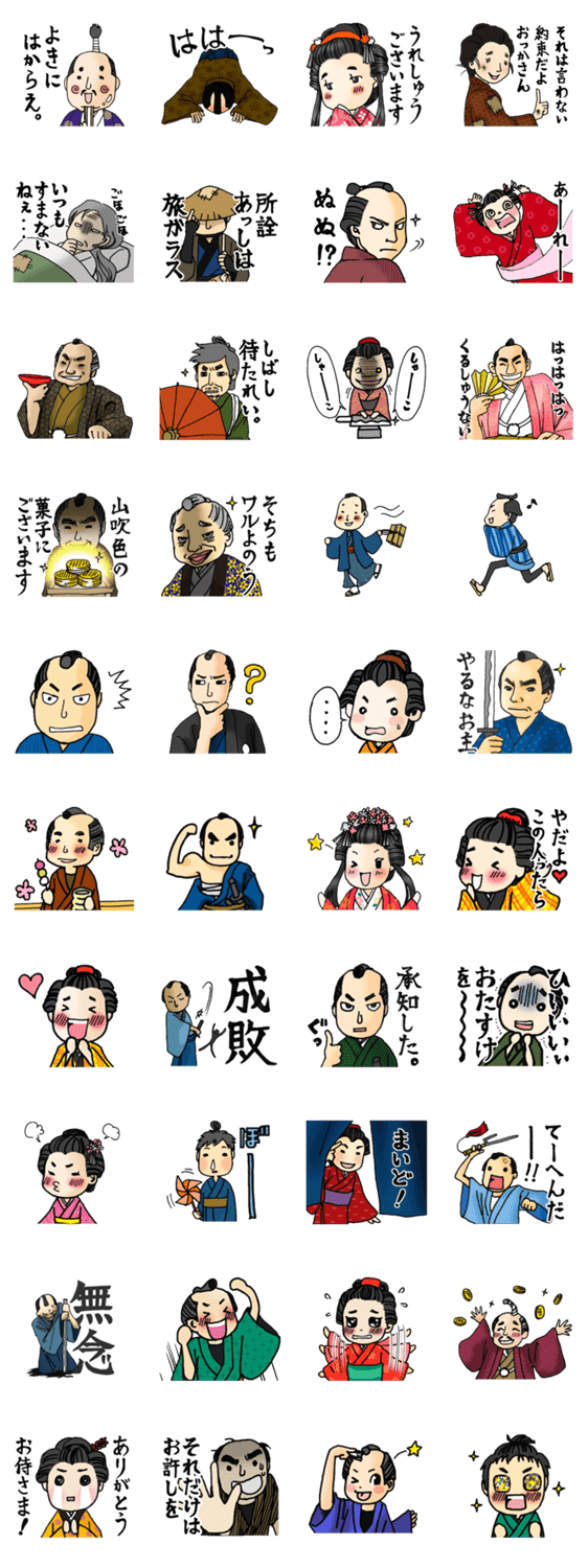 SAMURAI COMPANY mash コメントをどうぞ 侍・殿・姫・町娘・岡っ引きなどなど、江戸に住む個性豊かな面々が勢ぞろい!粋な江戸っ子のバラエティに富んだ姿・言葉で一風変わったトークをどうぞ☆ このスタンプどう思う?!↓クリックで投票♪好き (0)かわいい (0)かっこいい (0)おもしろい (0)使いやすそう (0)欲しい (0)萌え (0)ほっこりする (0)おしゃれ (0)ゆるい (0)こわい (0)ウザい (0)キモい (0)ムカつく (0)持ってる (0)癒される (0)セクシー (0)個性的 (0)私は買わない (0)誰かプレゼントして! (0) 購入・プレゼントする Facebookでシェア Twitterでシェア