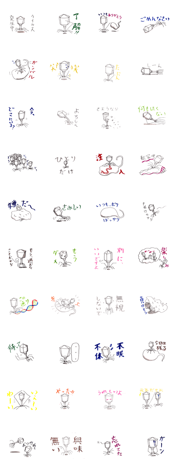 T2ファージ MUGITO コメントをどうぞ 今まで類を見なかったスタンプ、T2ファージ。ウイルスだからこそ、伝えられることがきっとあります。T2ファージだからこそ微妙な気持ちを伝えられます。 このスタンプどう思う?!↓クリックで投票♪好き (1)かわいい (1)かっこいい (0)おもしろい (0)使いやすそう (0)欲しい (0)萌え (1)ほっこりする (0)おしゃれ (0)ゆるい (0)こわい (0)ウザい (0)キモい (0)ムカつく (0)持ってる (0)癒される (0)セクシー (0)個性的 (0)私は買わない (0)誰かプレゼントして! (0) 購入・プレゼントする Facebookでシェア Twitterでシェア