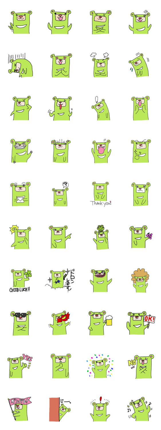 The Green Bear! machapo コメントをどうぞ ある日森の中 ミドリのクマさんに 出会った..........The other day, I met a bear, A great green bear, A way up there. このスタンプどう思う?!↓クリックで投票♪好き (0)かわいい (0)かっこいい (0)おもしろい (0)使いやすそう (0)欲しい (0)萌え (0)ほっこりする (0)おしゃれ (0)ゆるい (0)こわい (0)ウザい (0)キモい (0)ムカつく (0)持ってる (0)癒される (0)セクシー (0)個性的 (0)私は買わない (0)誰かプレゼントして! (0) 購入・プレゼントする Facebookでシェア Twitterでシェア