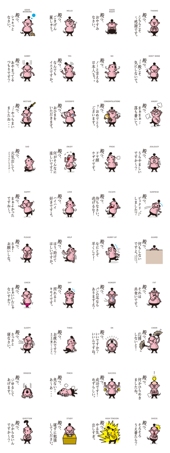 TON-O ましゃみ コメントをどうぞ かわいい子豚の殿様です。殿様の生活は厳しいようです。 このスタンプどう思う?!↓クリックで投票♪好き (0)かわいい (0)かっこいい (0)おもしろい (0)使いやすそう (0)欲しい (0)萌え (0)ほっこりする (0)おしゃれ (0)ゆるい (0)こわい (0)ウザい (0)キモい (0)ムカつく (0)持ってる (0)癒される (0)セクシー (0)個性的 (0)私は買わない (0)誰かプレゼントして! (0) 購入・プレゼントする Facebookでシェア Twitterでシェア