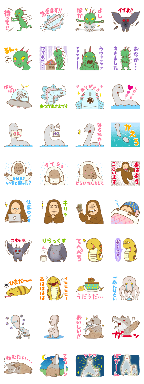 UMAだよ!ほぼ全員集合! micanstar コメントをどうぞ チュパカブラやイエティ、ちょっとマイナーなベアウルフからナイトクローラーまで、誰しも一度は心踊らせた、あの未確認生物たちがスタンプとなってあなたの生活を彩る! このスタンプどう思う?!↓クリックで投票♪好き (0)かわいい (0)かっこいい (0)おもしろい (0)使いやすそう (0)欲しい (0)萌え (0)ほっこりする (0)おしゃれ (0)ゆるい (0)こわい (0)ウザい (0)キモい (0)ムカつく (0)持ってる (0)癒される (0)セクシー (0)個性的 (0)私は買わない (0)誰かプレゼントして! (0) 購入・プレゼントする Facebookでシェア Twitterでシェア