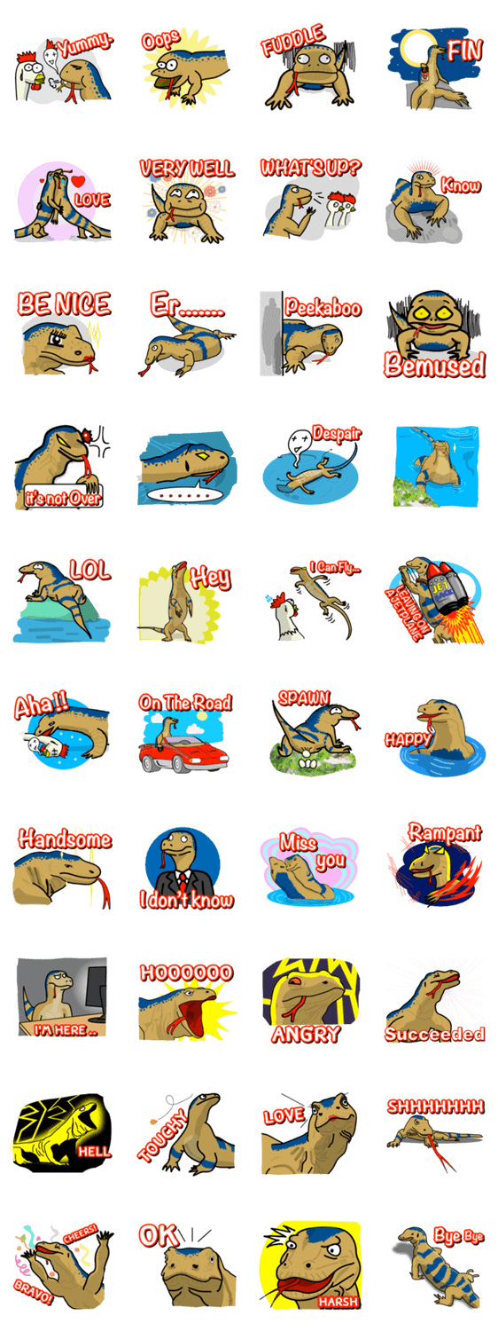 Water monitor [ENG] Eak Raidernon コメントをどうぞ It is not chameleon. It is not crocodile. But it like eat a chicken. And it have character cute.Same species Komodo Dragon このスタンプどう思う?!↓クリックで投票♪好き (0)かわいい (0)かっこいい (0)おもしろい (0)使いやすそう (0)欲しい (0)萌え (0)ほっこりする (0)おしゃれ (0)ゆるい (0)こわい (0)ウザい (0)キモい (0)ムカつく (0)持ってる (0)癒される (0)セクシー (0)個性的 (0)私は買わない (0)誰かプレゼントして! (0) 購入・プレゼントする Facebookでシェア Twitterでシェア